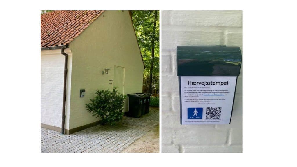 Find the stamp: The Hærvej stamp is in a box on the gable of the gravedigger's building at Hammer Church and Cemetery. The church is beautifully situated on the edge of Hammer Hills.